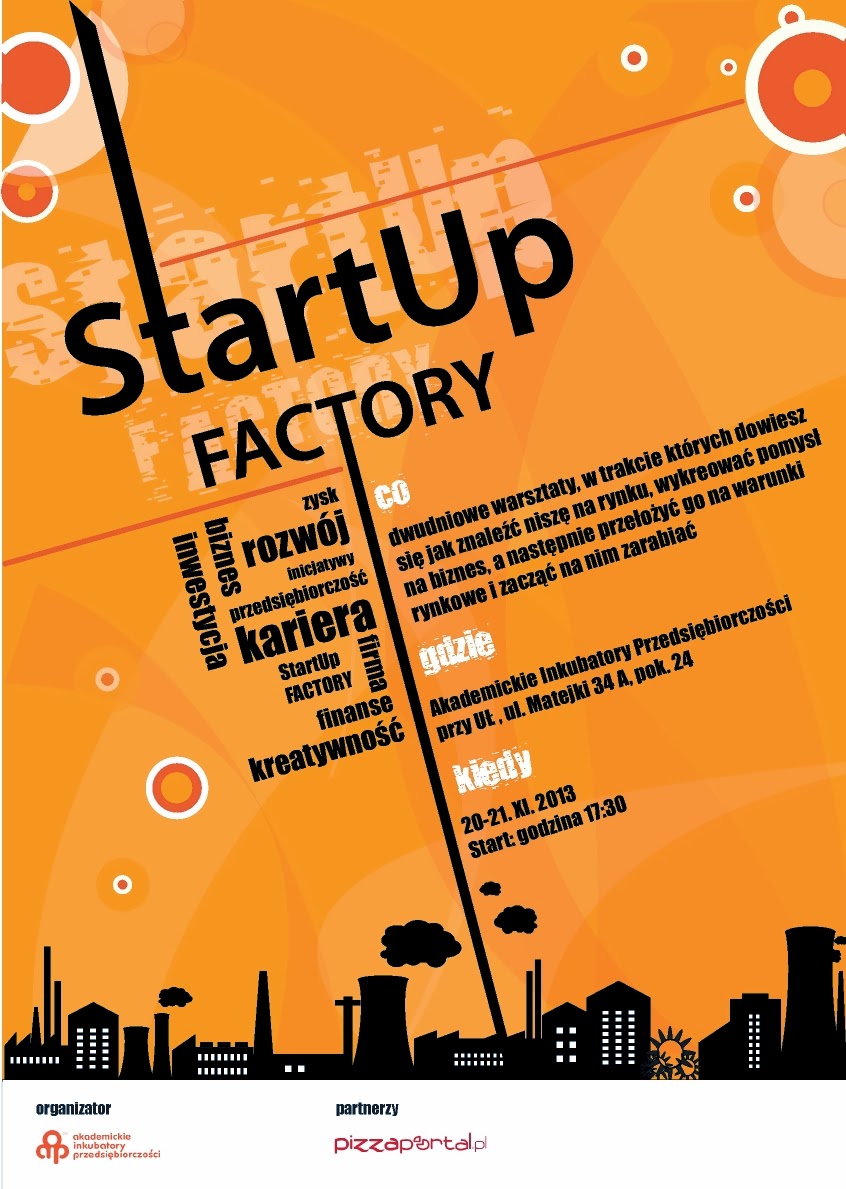 PizzaPortal.pl wraz z Akademickimi Inkubatorami Przedsiębiorczości zaprasza na dwudniowe szkolenie, w trakcie których dowiesz się jak znaleźć niszę na rynku, wykreować pomysł na biznes, a następnie przełożyć go na warunki rynkowe i zacząć na nim zarabiać. StartUp Factory to inicjatywa organizowana przez Akademickie Inkubatory Przedsiębiorczości w Łodzi. Szkolenia mają na celu pobudzenie przedsiębiorczości oraz edukację z zakresu kreowania umiejętności biznesowych.